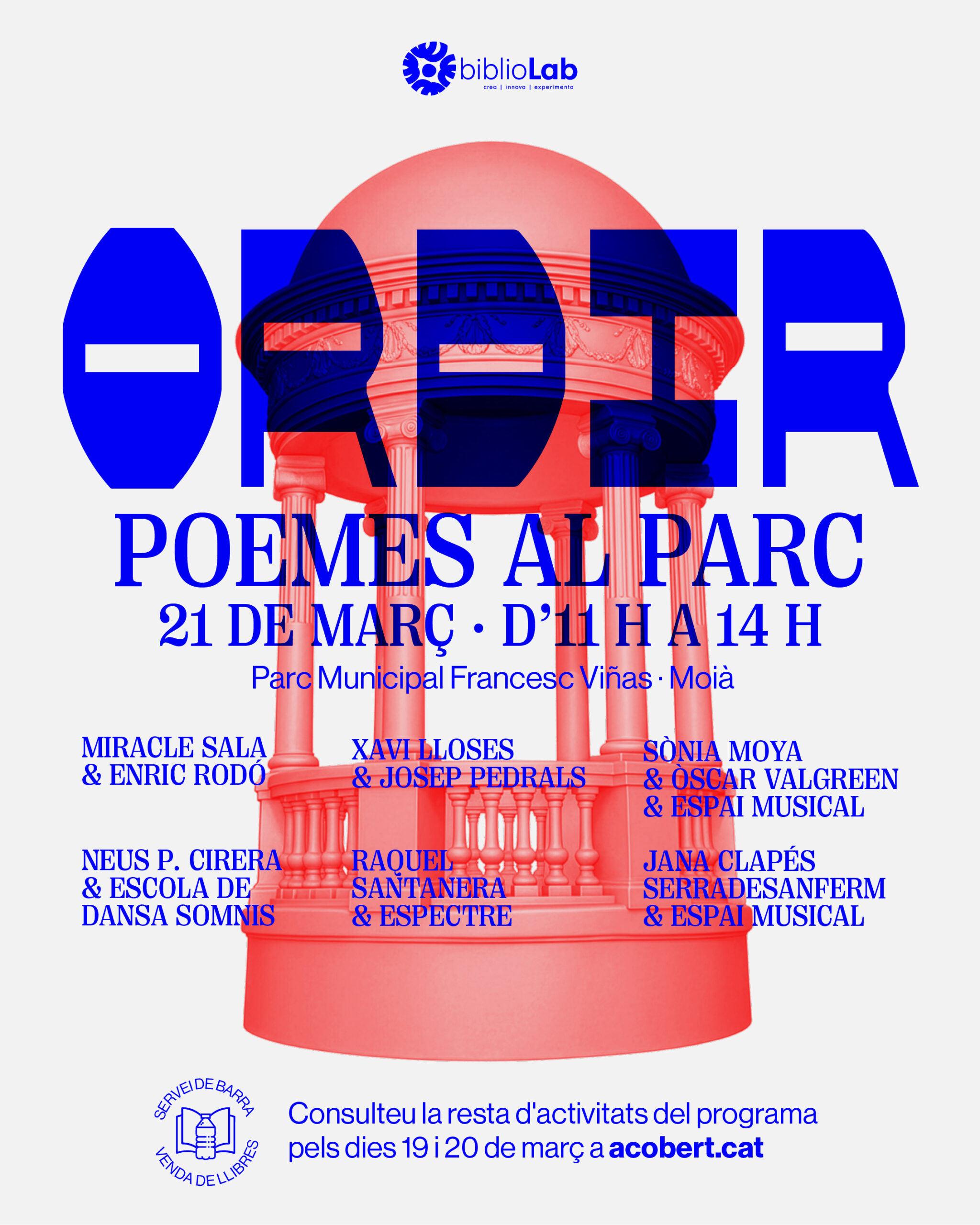 « Tots els Esdeveniments Aquest esdeveniment ja ha passat. ORDIR. Poesia als parcs març 21 @ 12:00 pm « Lectura i conversa al voltant de Dir el monstre Fermentar » + Google Calendar+ Afegeix a iCalendar Mostra els detalls Data: març 21 Hora: 12:00 pm Recinte Parc Municipal de Moia